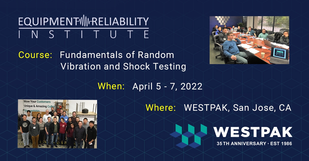 WESTPAK’s accredited San Jose test lab is proud to host the Equipment Reliability Institute’s course “Fundamentals of Random Vibration and Shock Testing” from April 5 – 7, 2022. Discounts are available for groups of three or more.